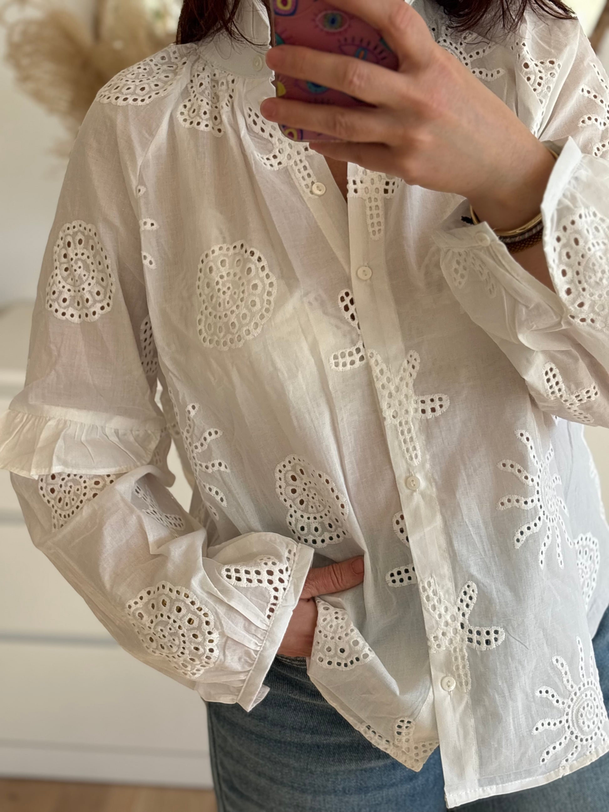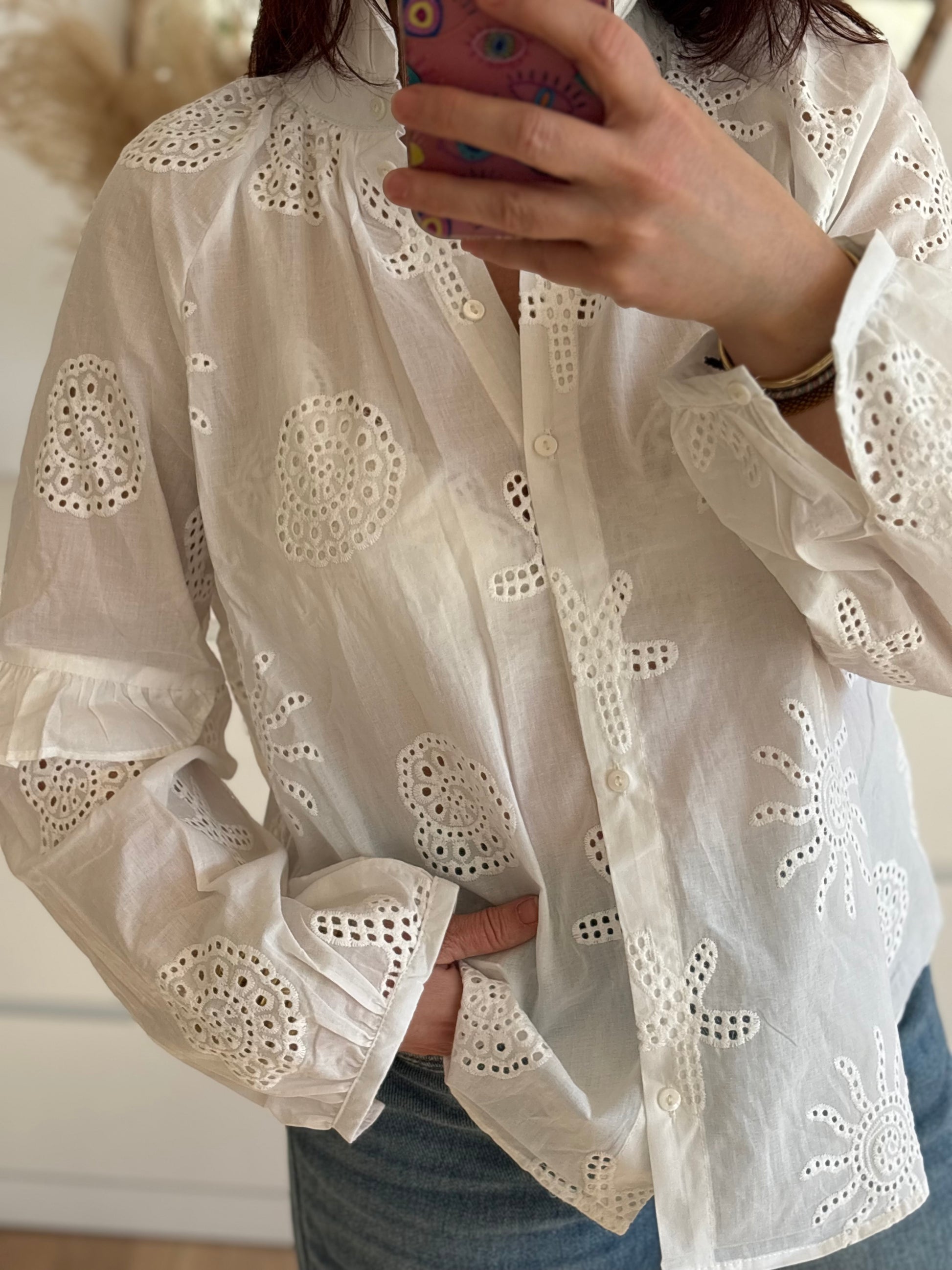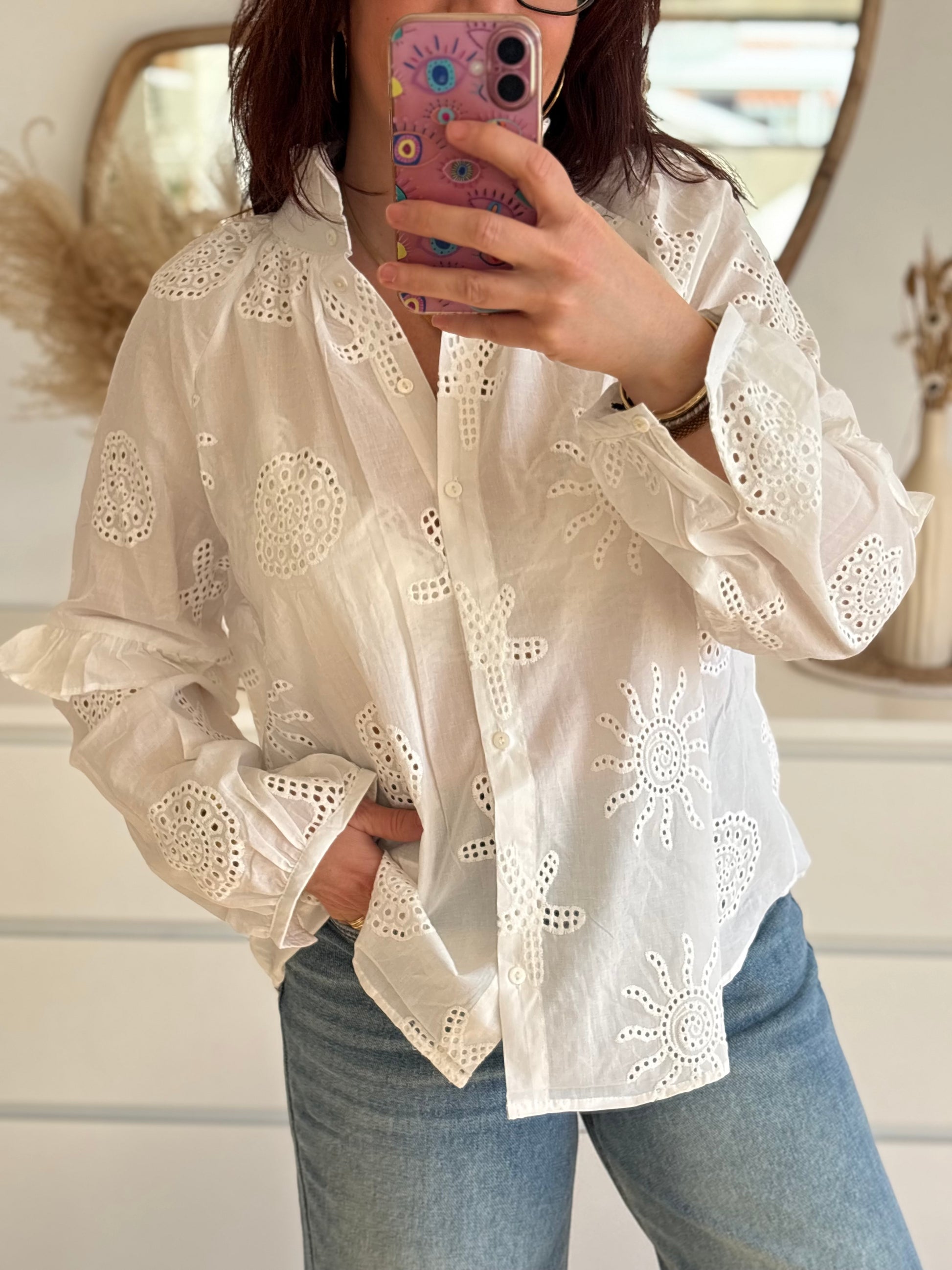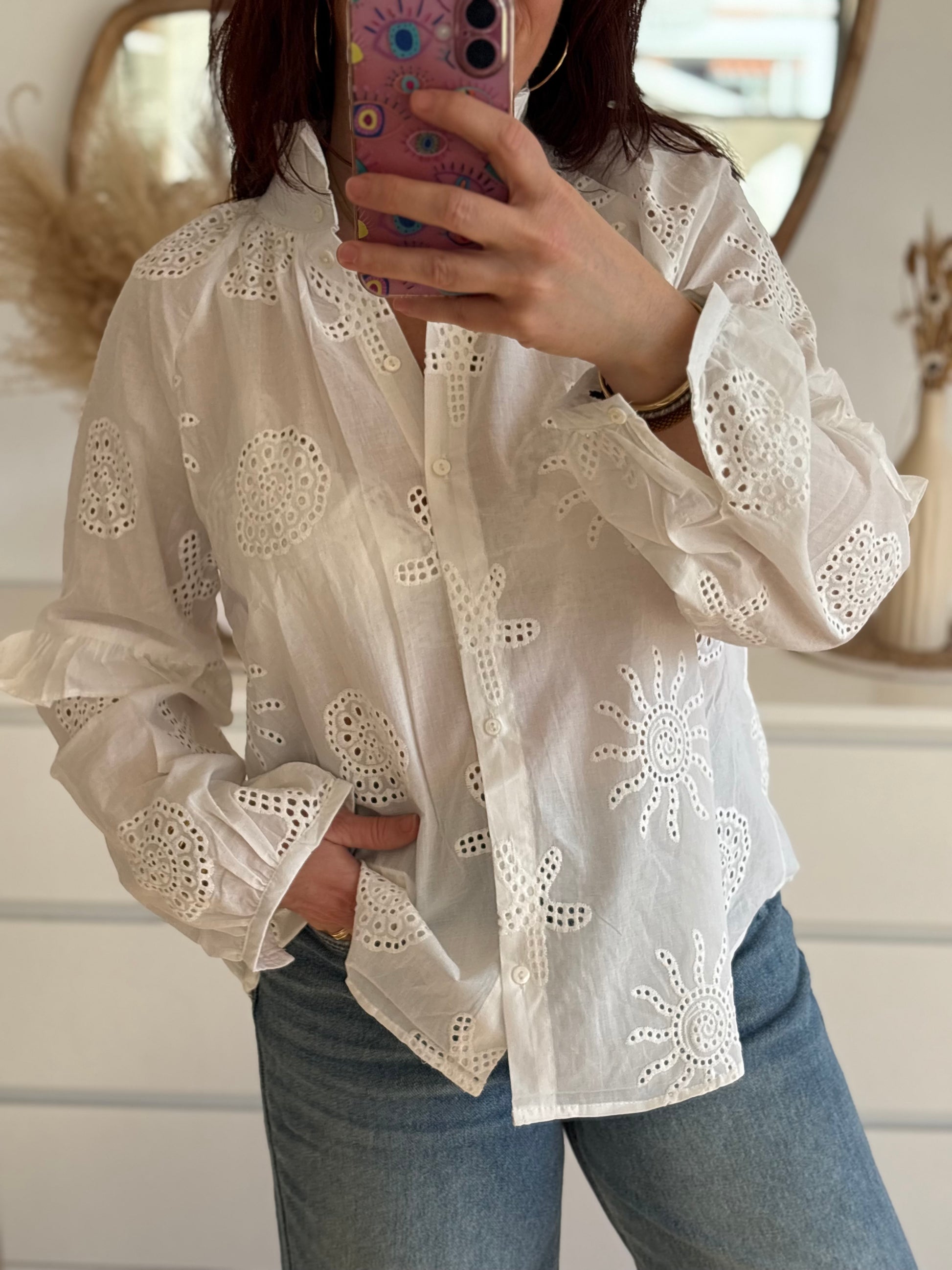 À porter avec un jean clair ou brut pour un look bohème chic effortless. On l’adore aussi sous une veste sans manches teddy (unie ou imprimée) pour réchauffer la silhouette tout en laissant apparaître les jolis détails. Parfait avec des bijoux dorés pour accentuer l’esprit solaire ✨