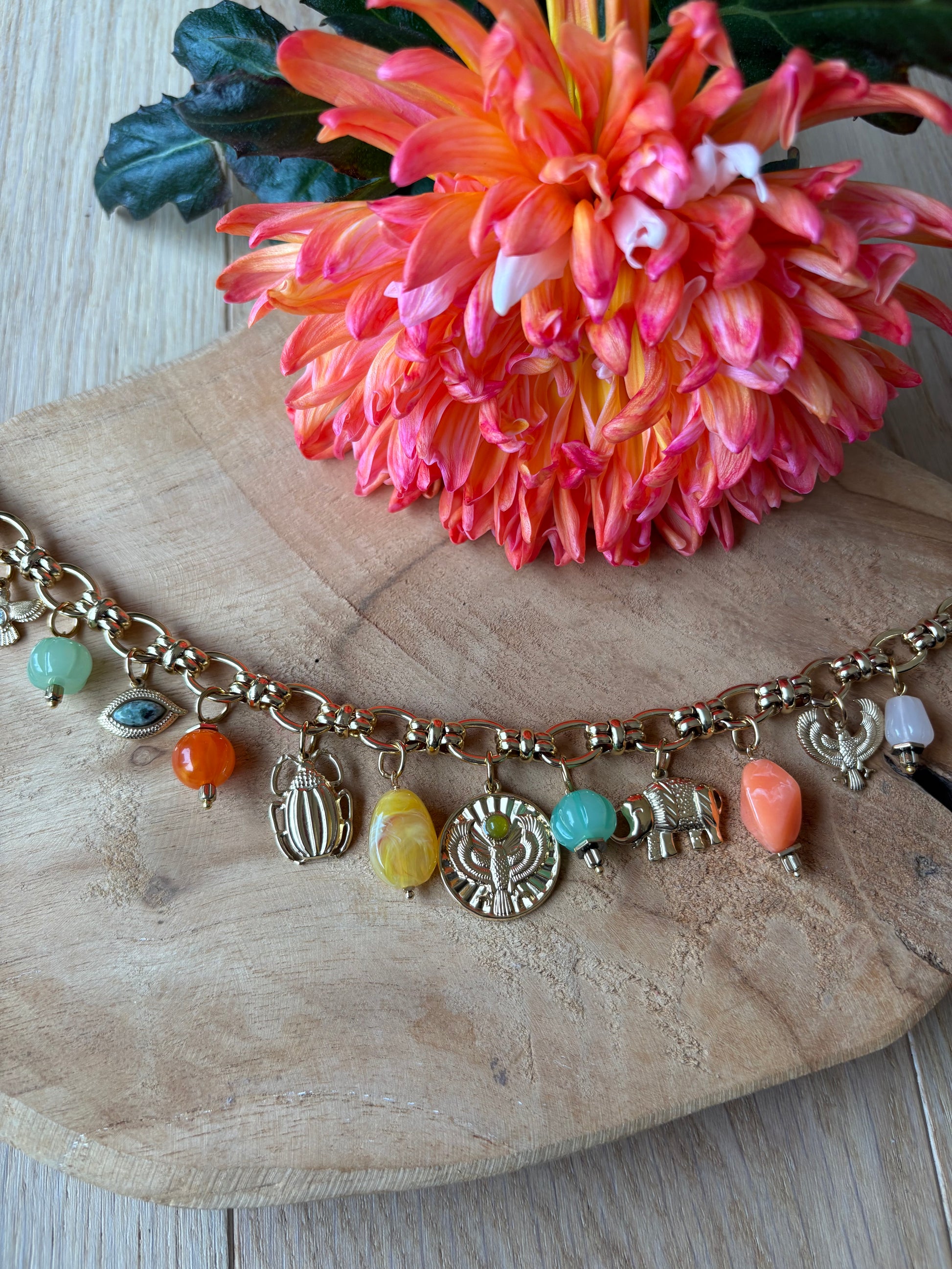 Chaque détail raconte une histoire : éléphant porte-bonheur, symboles protecteurs et perles aux couleurs lumineuses. Un bijou qui attire le regard et qui apporte immédiatement du caractère à une tenue.