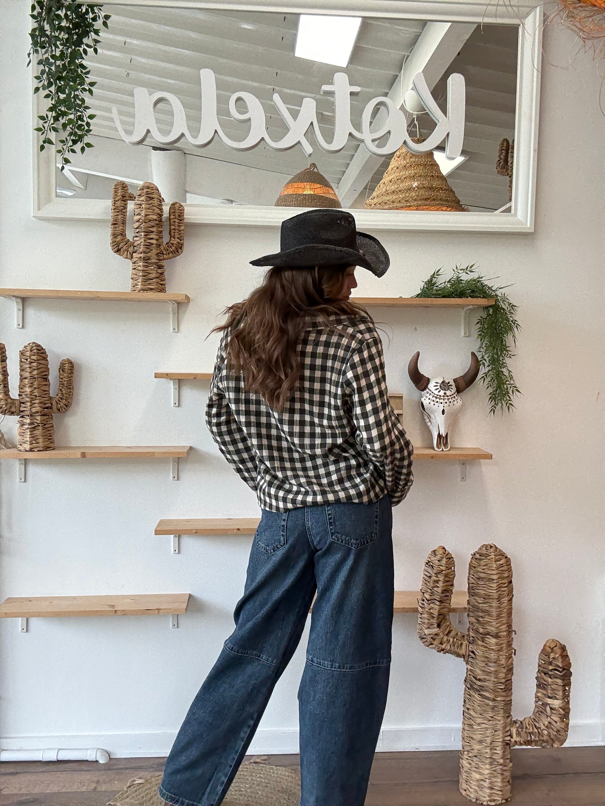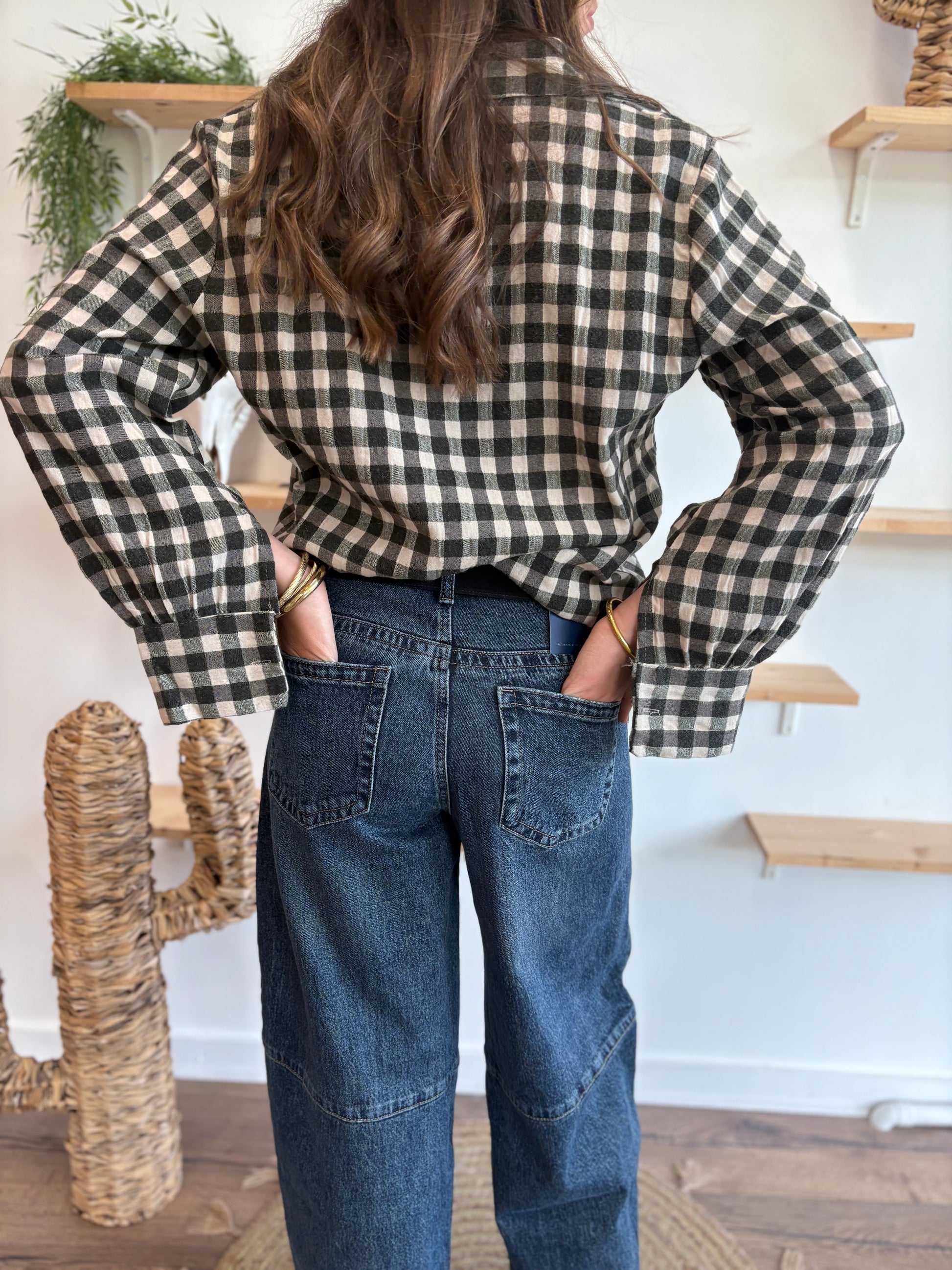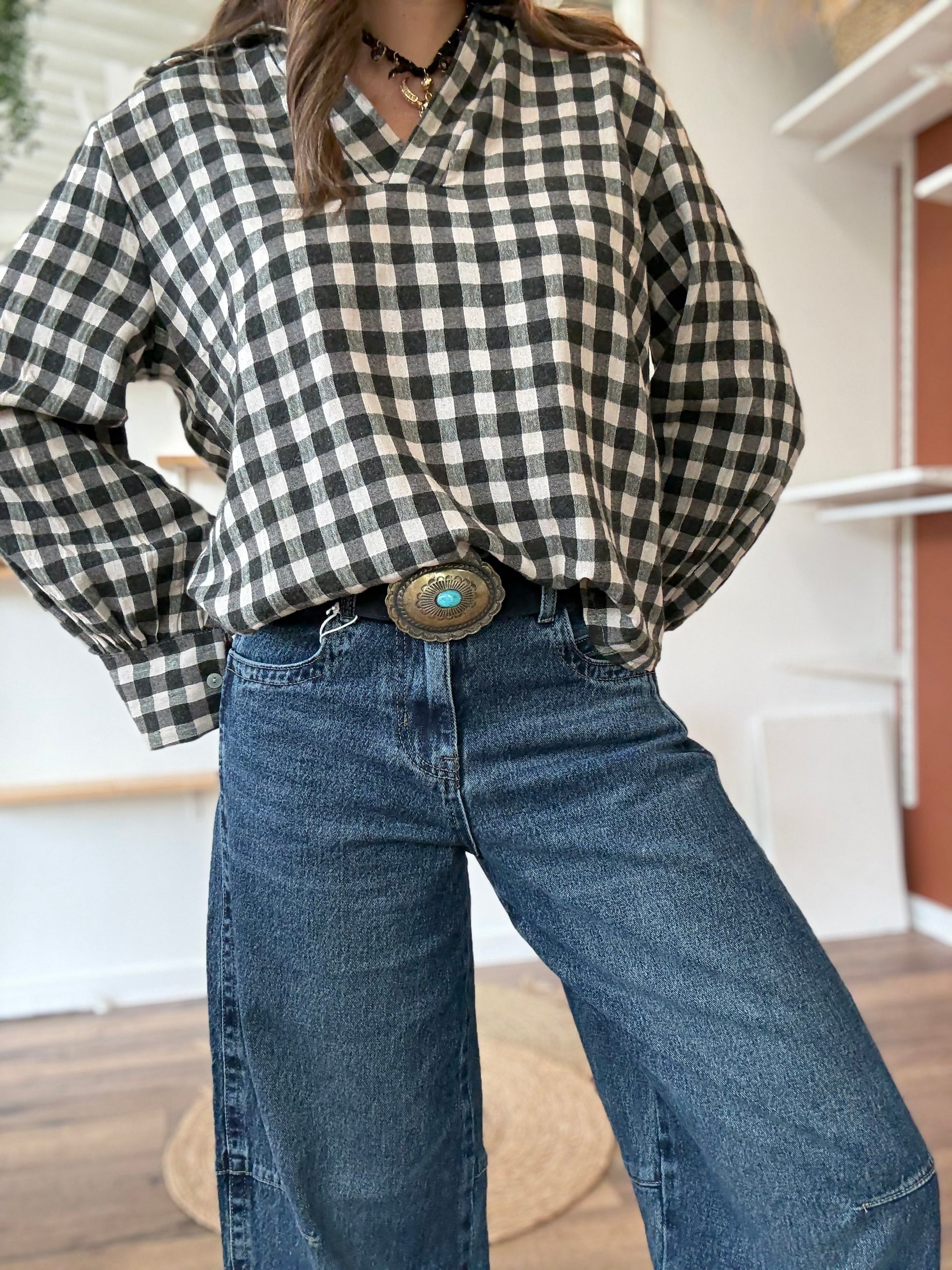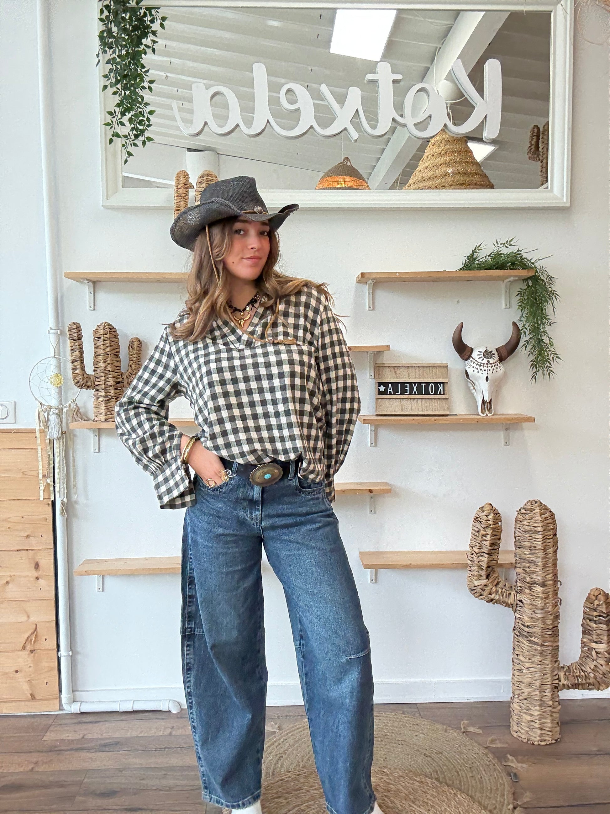 Conseil look : rentre une chemise à carreaux dans la taille haute et ajoute une ceinture western pour un look cowgirl assumé. Pour un style plus cool, porte-le avec une veste oversize et des baskets.