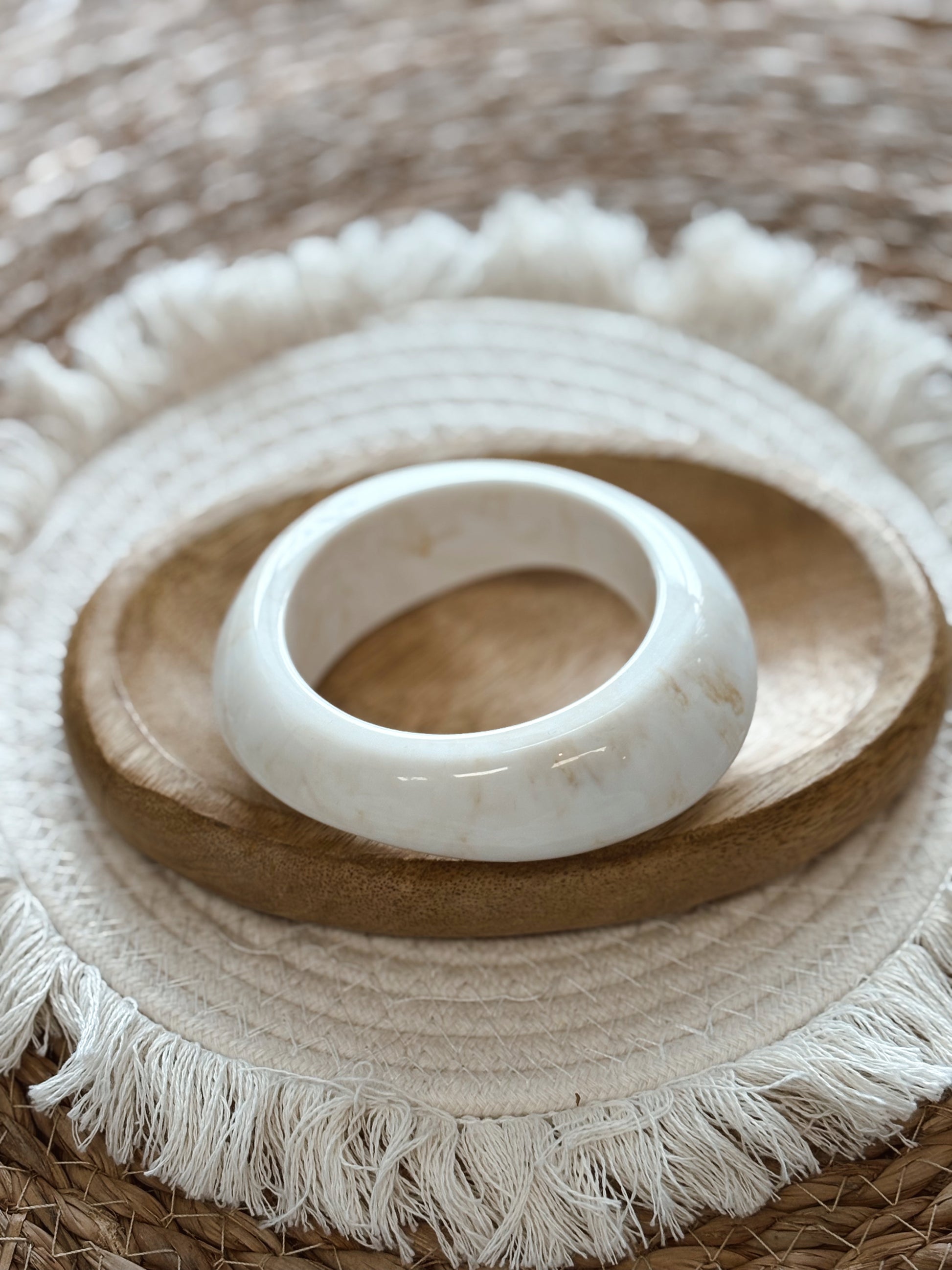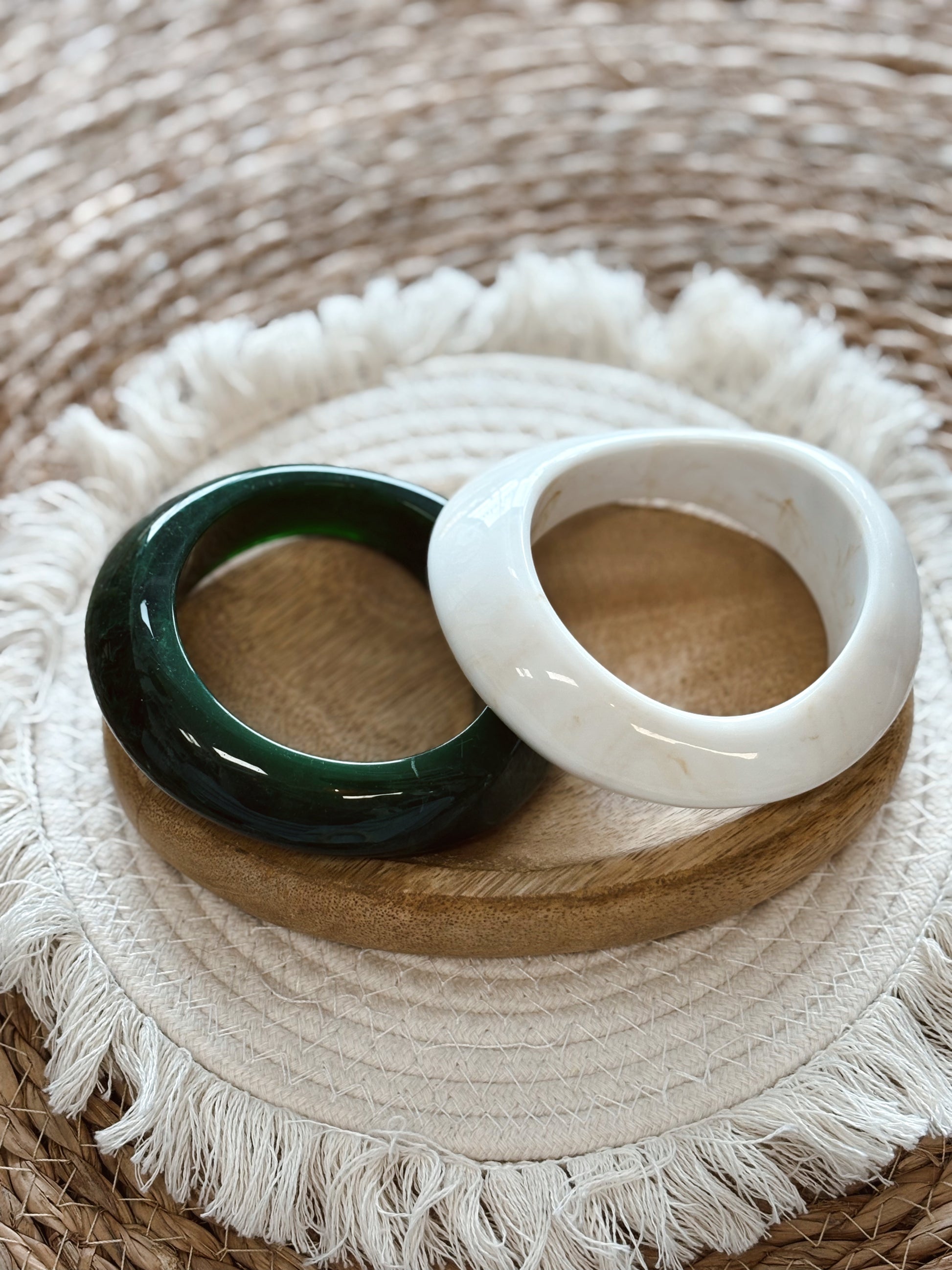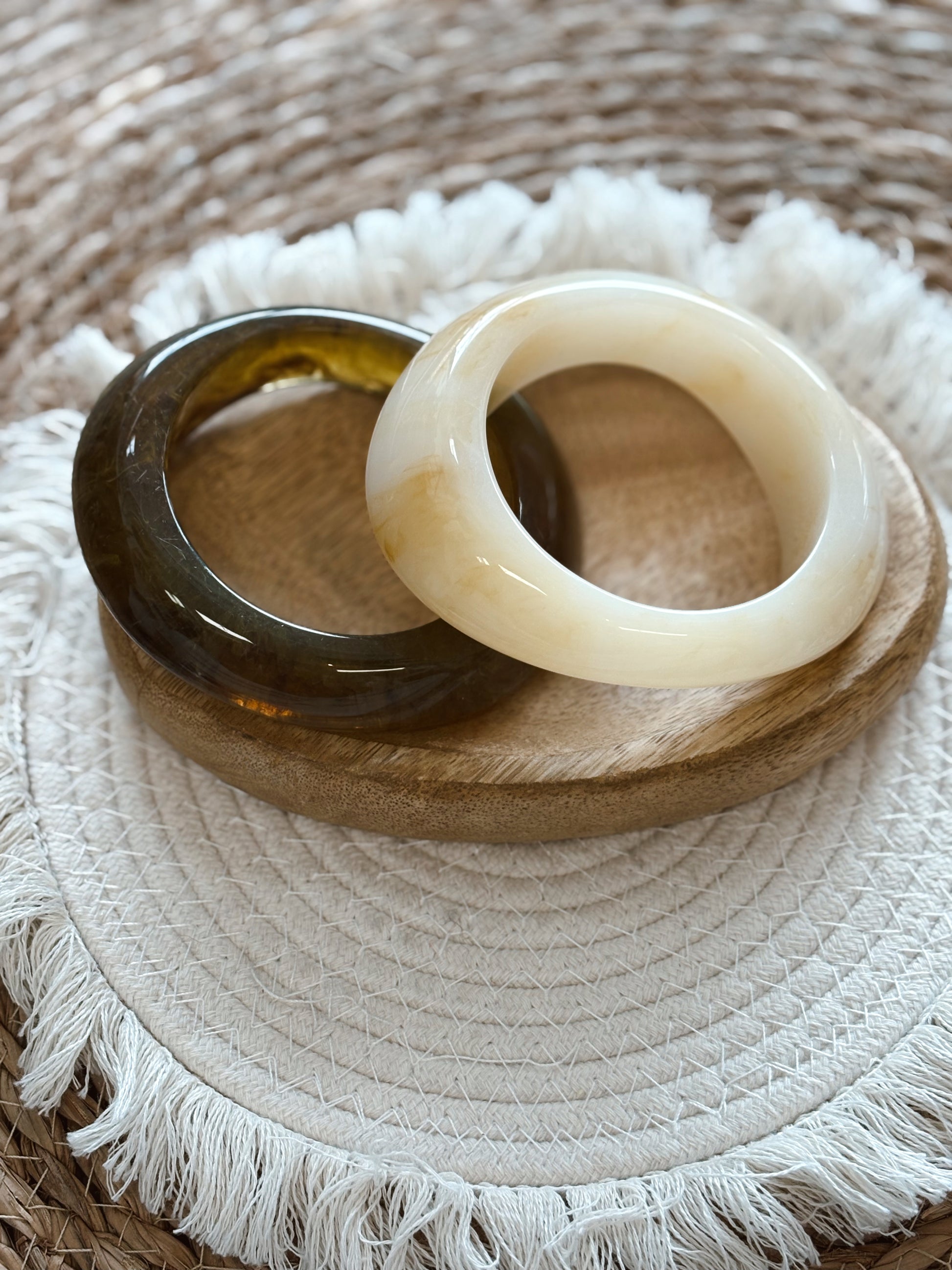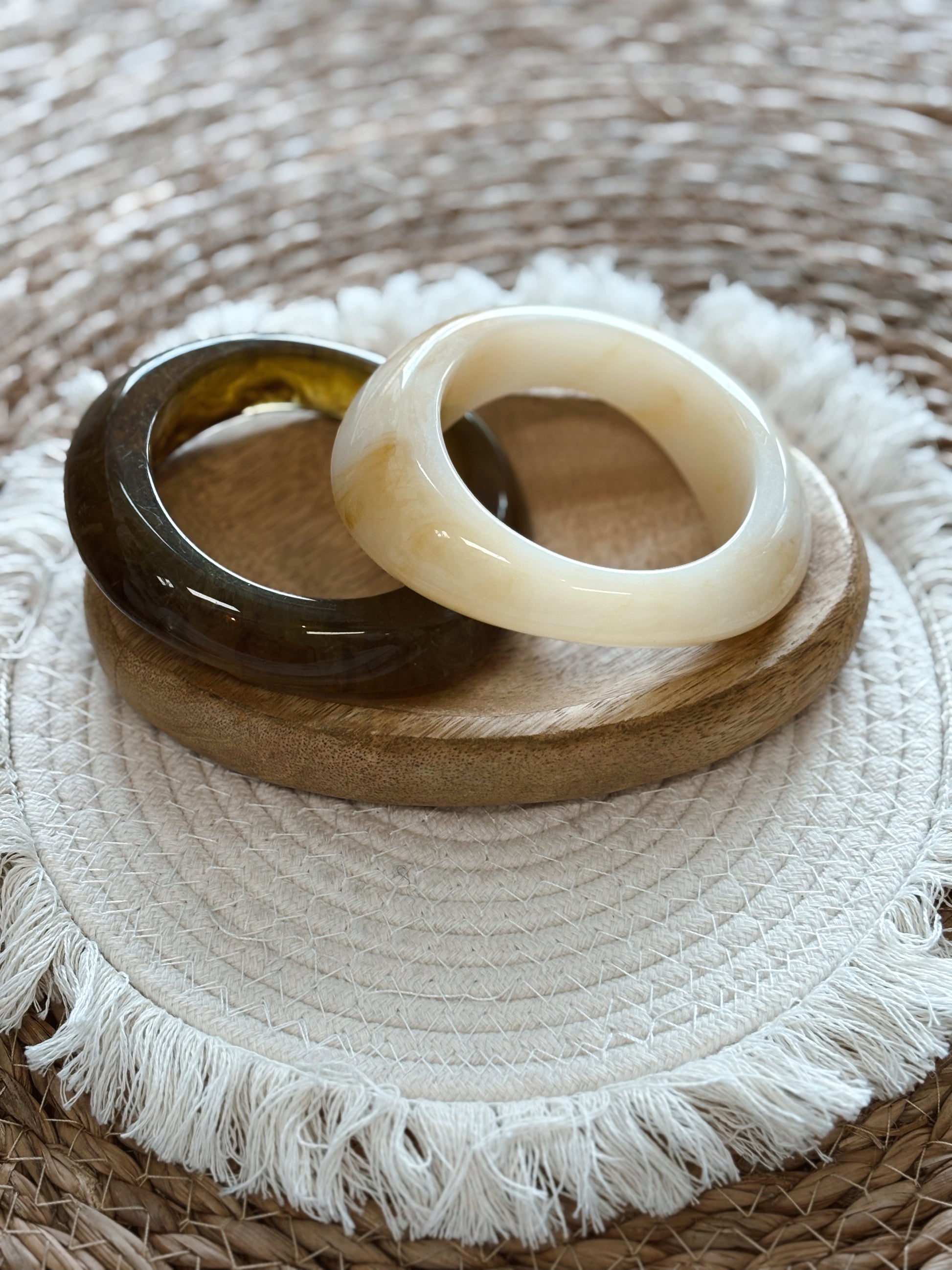 Adoptez un style à la fois intemporel et tendance avec ces bracelets en résine marbrée à la silhouette arrondie. Leur design plus doux et circulaire contraste élégamment avec les modèles carrés, pour varier vos looks selon vos envies.