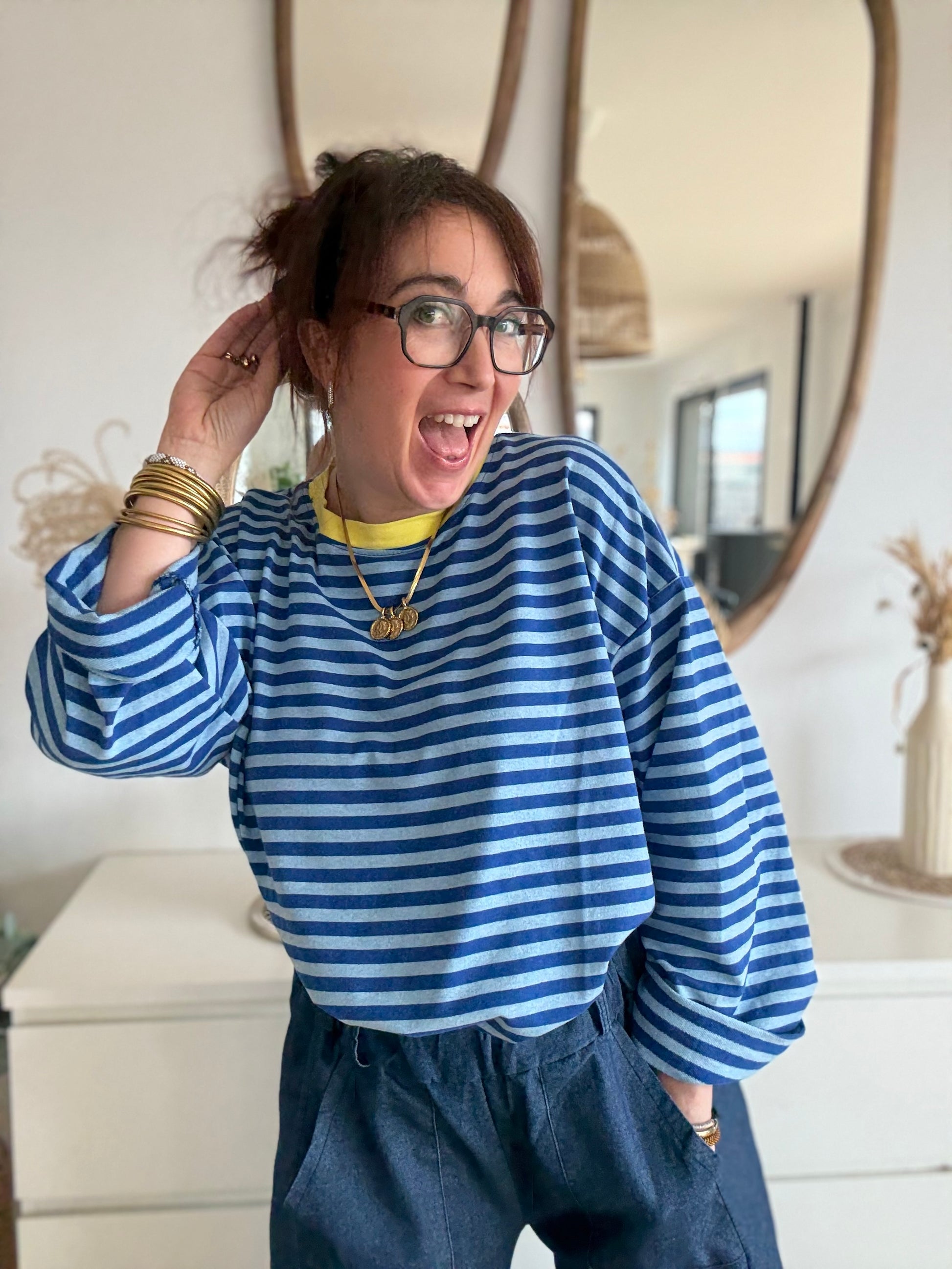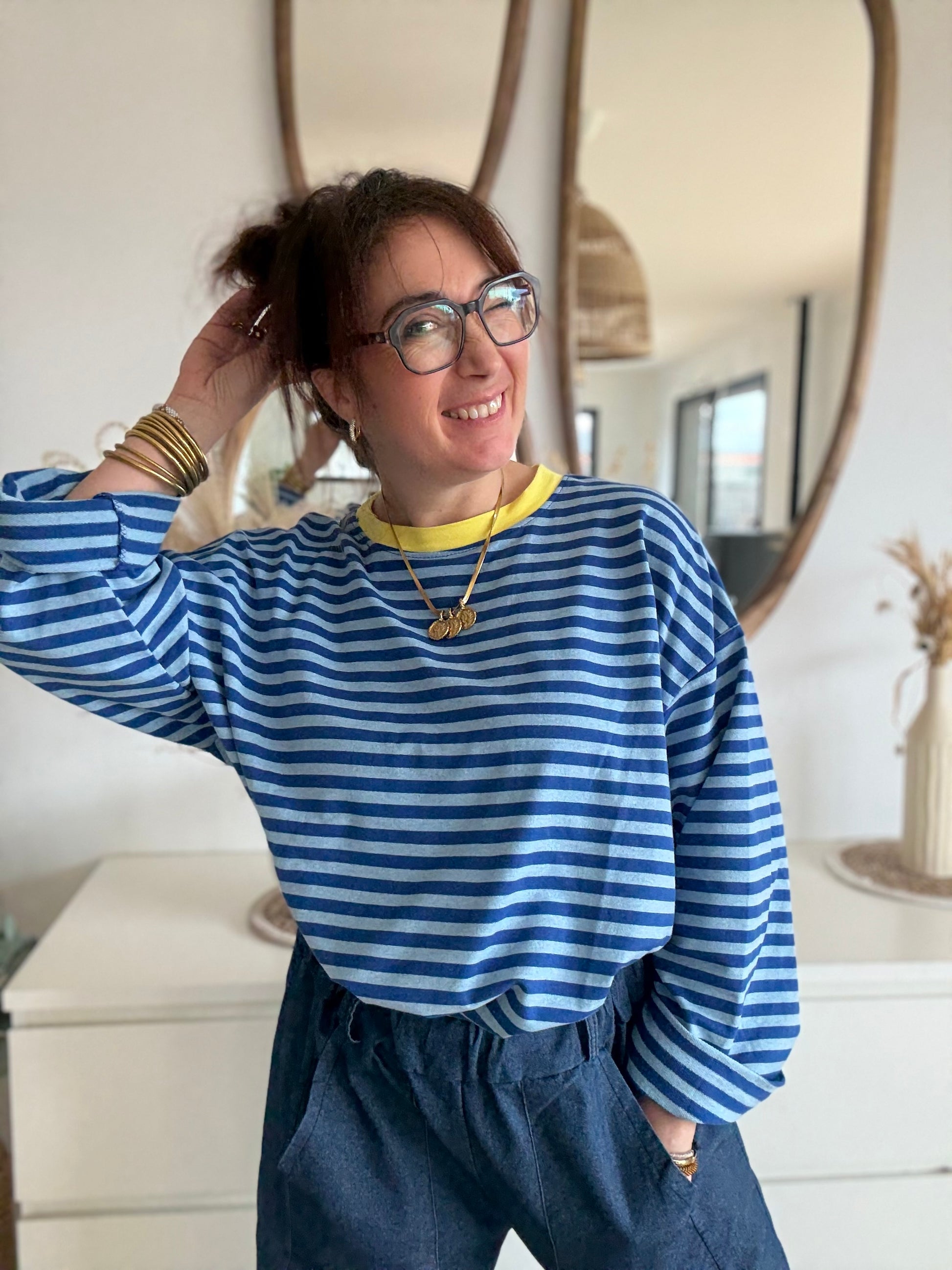 Avec ses rayures bleu roi et bleu jean et son col rond jaune ultra punchy, Gina se décline dans une version fraîche et vitaminée. Une pièce forte, joyeuse et facile à porter, qui apporte instantanément du style sans effort.