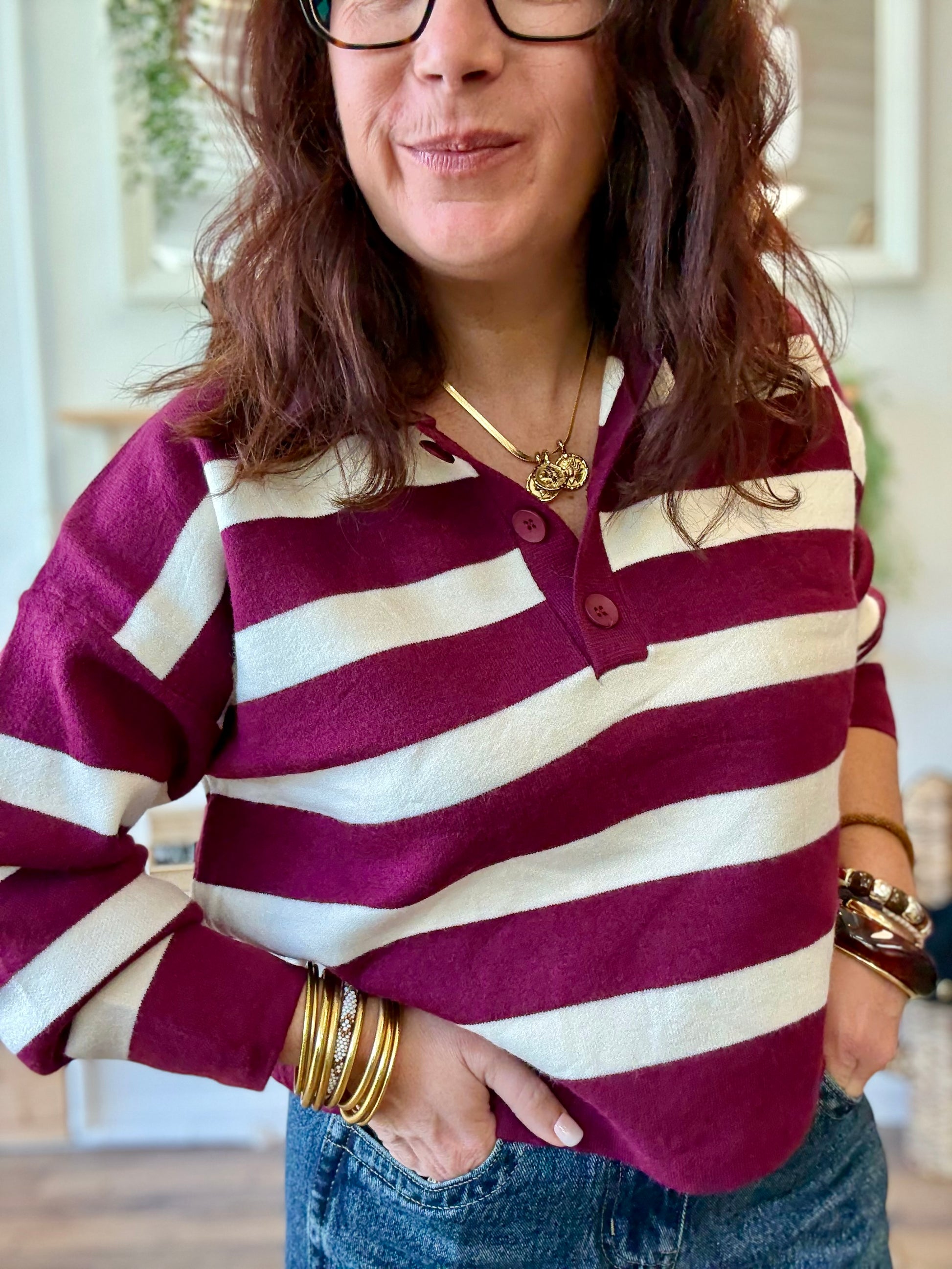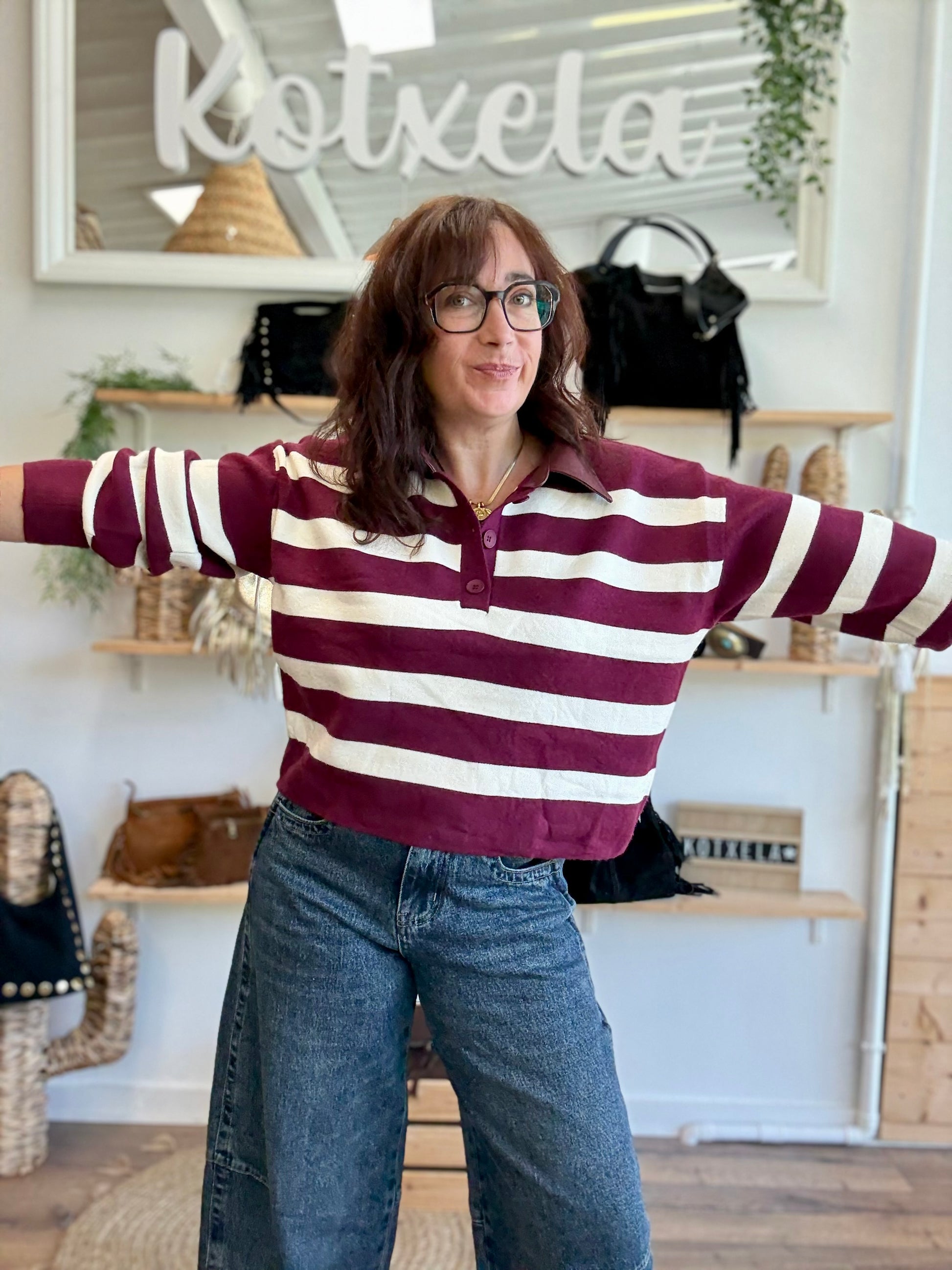 Ce polo rayé bordeaux & crème, twisté d’un col en simili, apporte une touche chic et rétro à vos looks d’automne.