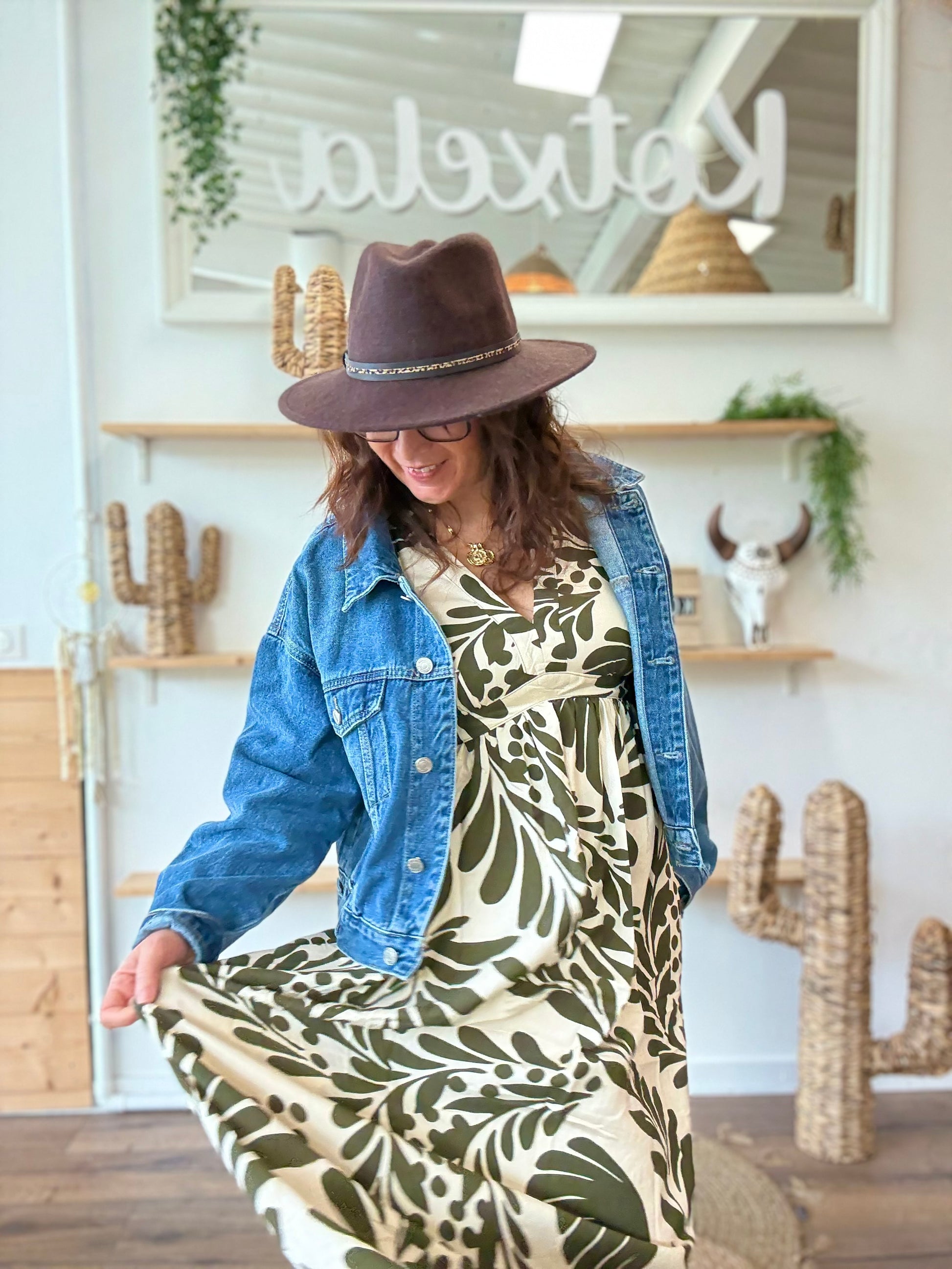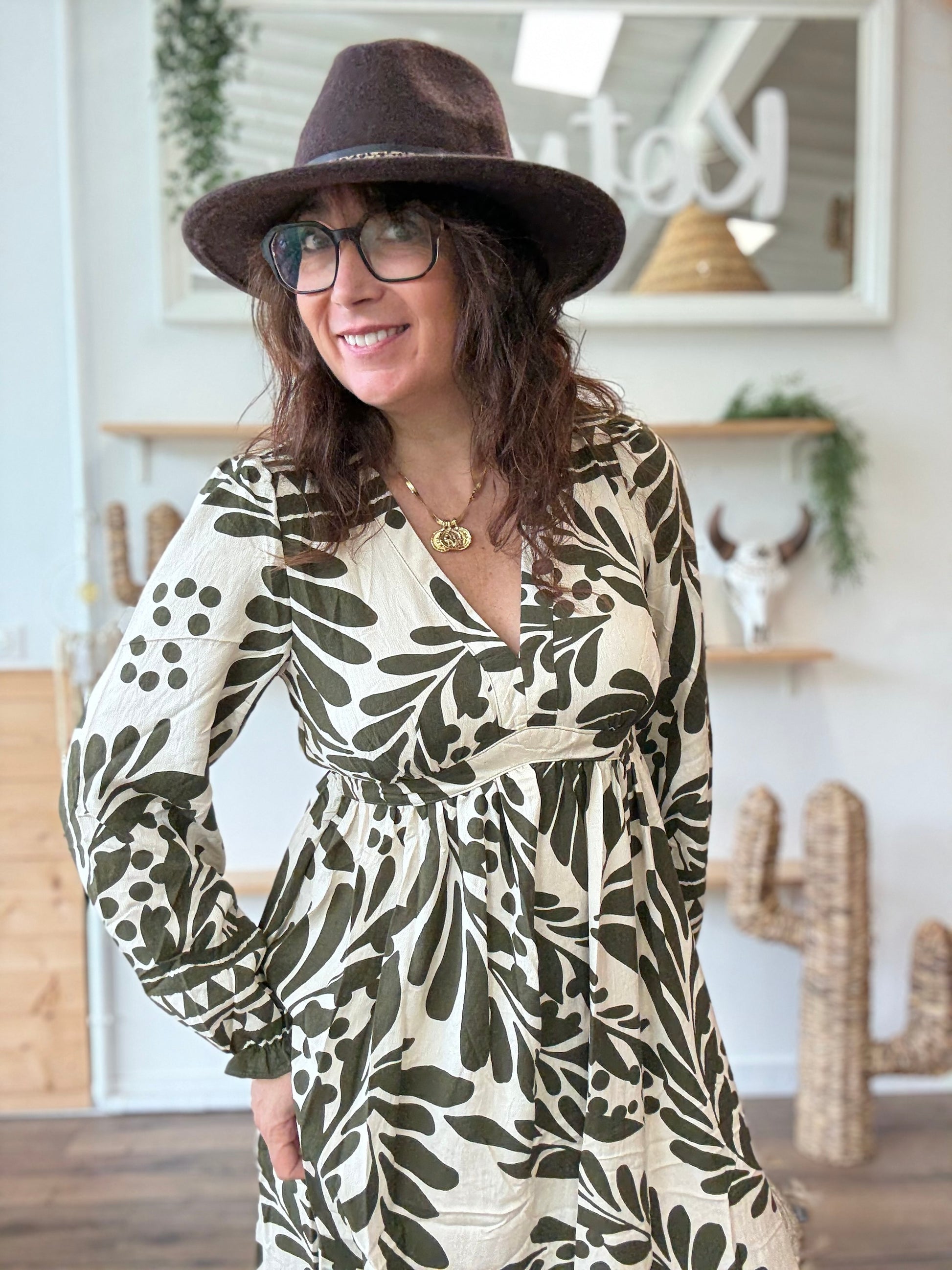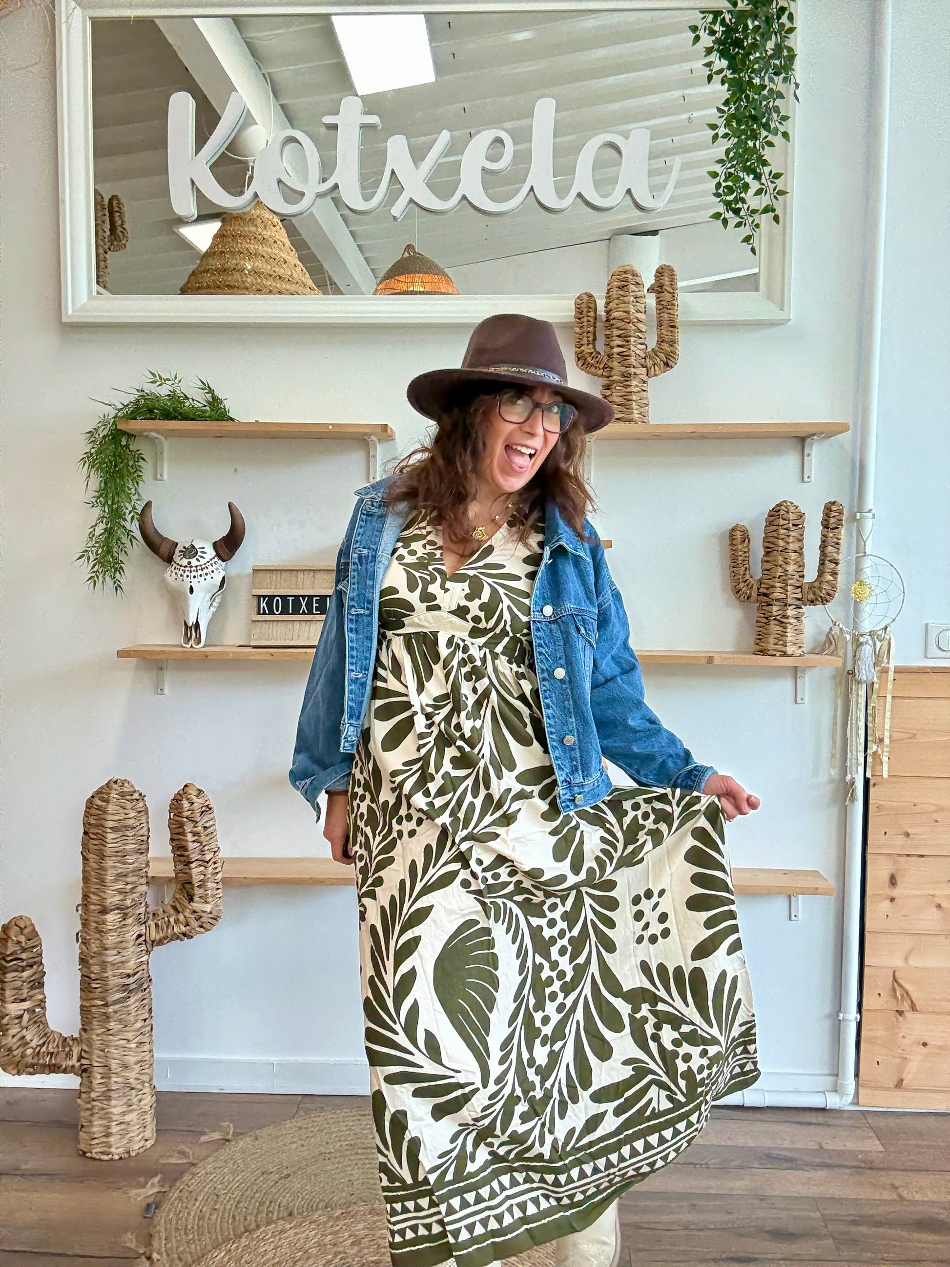 Version kaki de notre incontournable Santa Fe, cette robe allie confort et caractère. Avec son imprimé végétal contrasté, elle incarne l’esprit bohème chic twisté à la mode cowgirl.