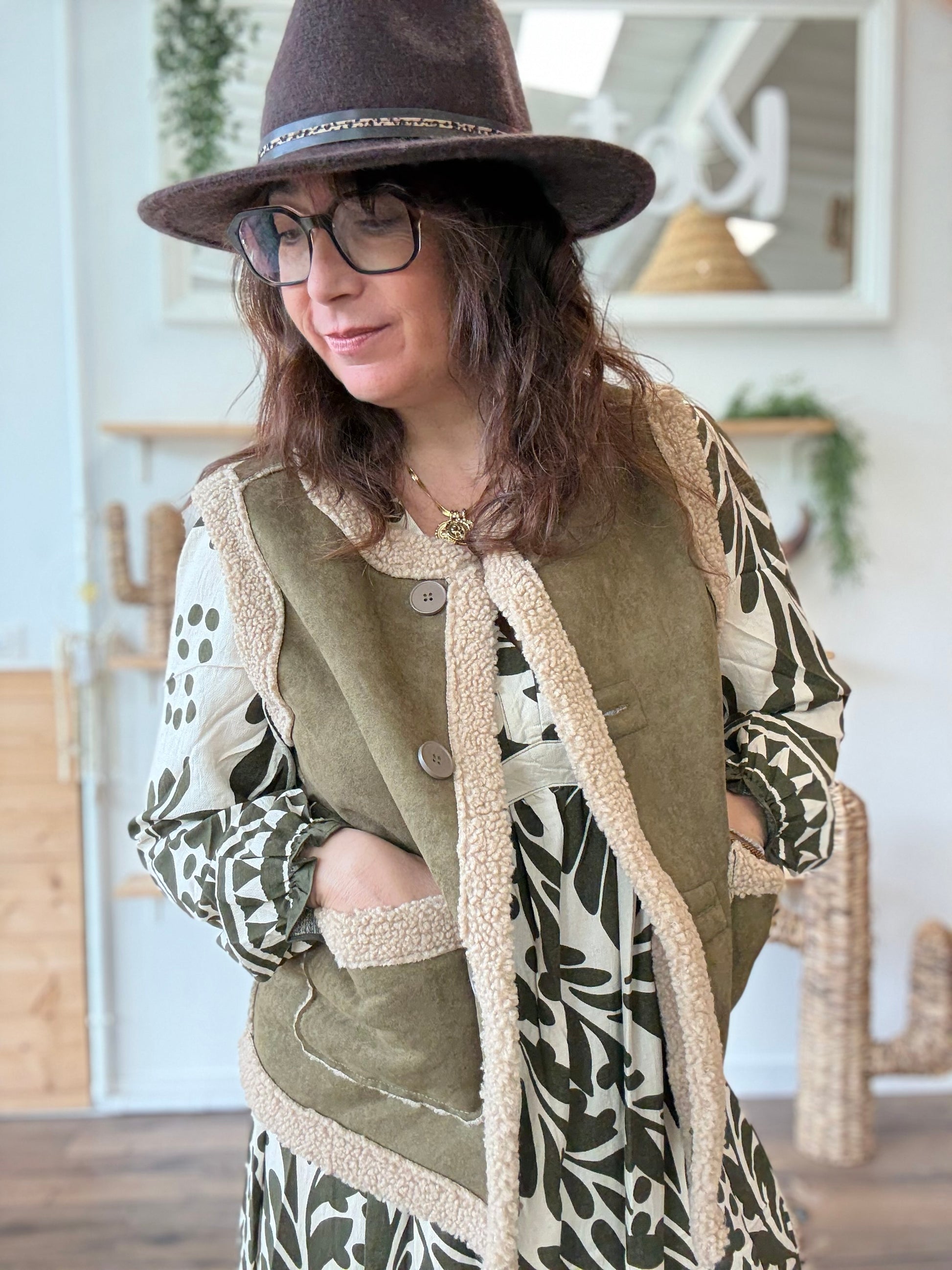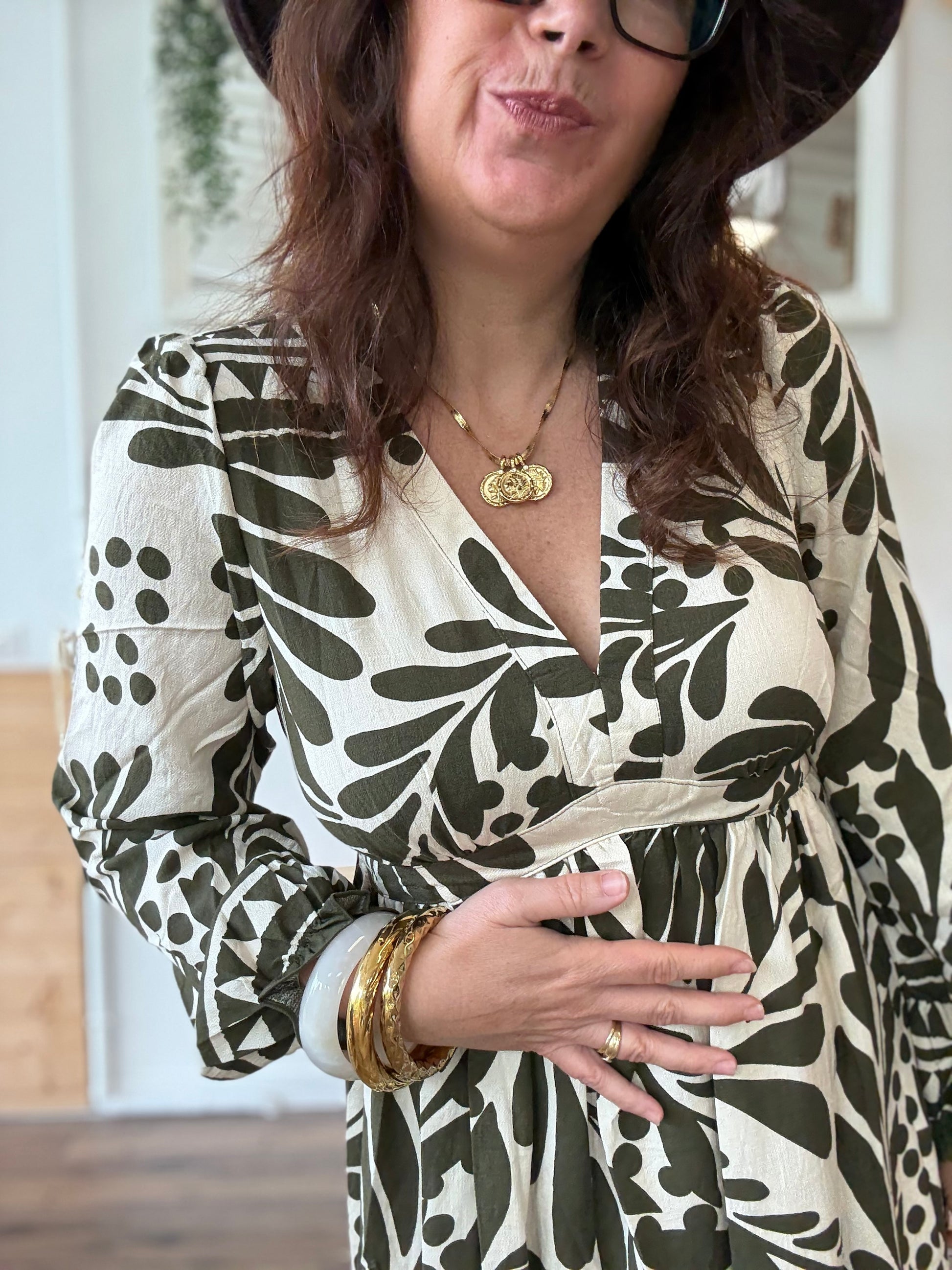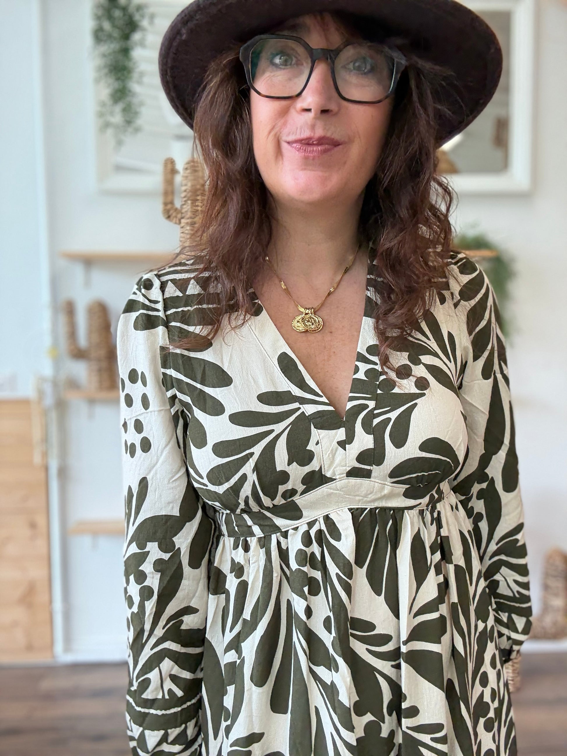 Version kaki de notre incontournable Santa Fe, cette robe allie confort et caractère. Avec son imprimé végétal contrasté, elle incarne l’esprit bohème chic twisté à la mode cowgirl.