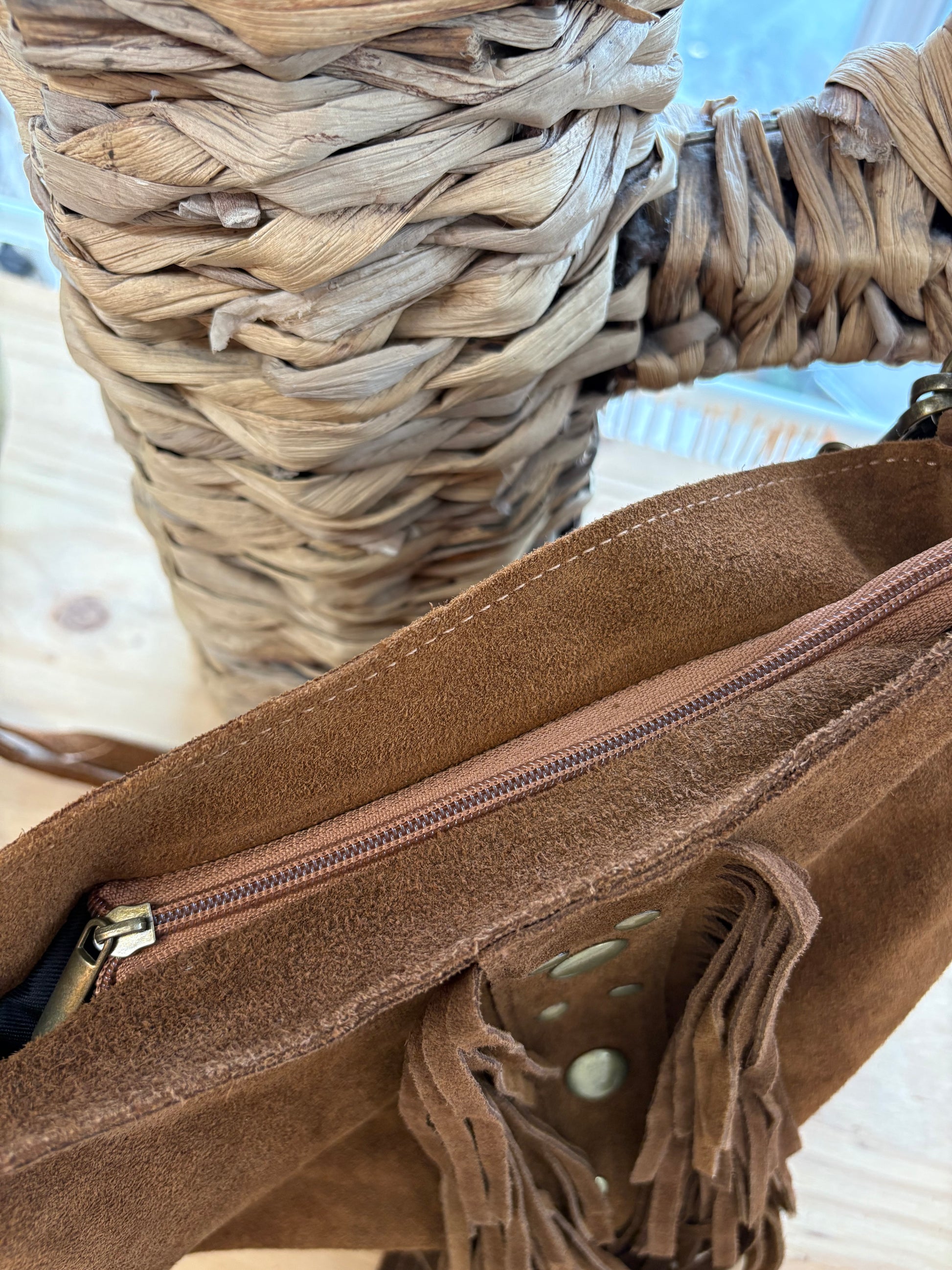 Le sac qui donne instantanément du caractère à vos looks ! En cuir vachette souple, il joue la carte du style bohème et western avec ses franges et ses clous dorés. Pratique et spacieux, il se porte aussi bien à la main qu’en bandoulière.