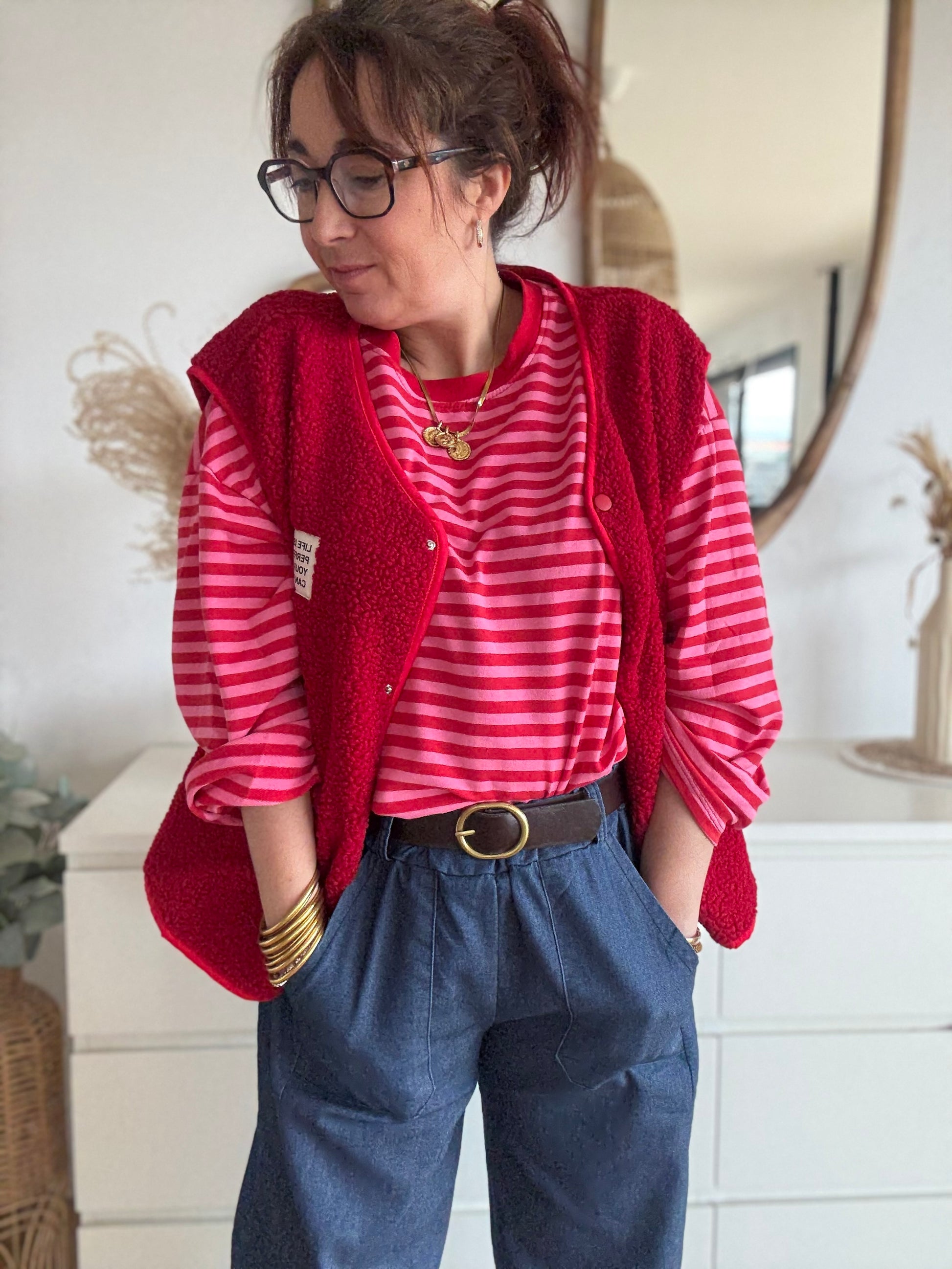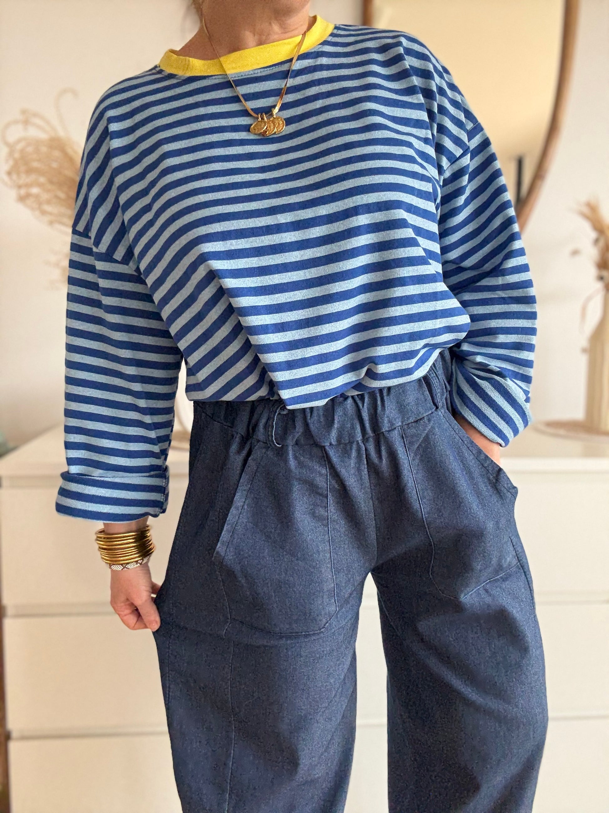 Marco adore les pulls cosy, les sweats cool ou une blouse plus féminine. Portez-le avec un pull loose rentré devant + baskets pour un look effortless, ou avec une maille colorée Kotxela pour la touche wahou ✨