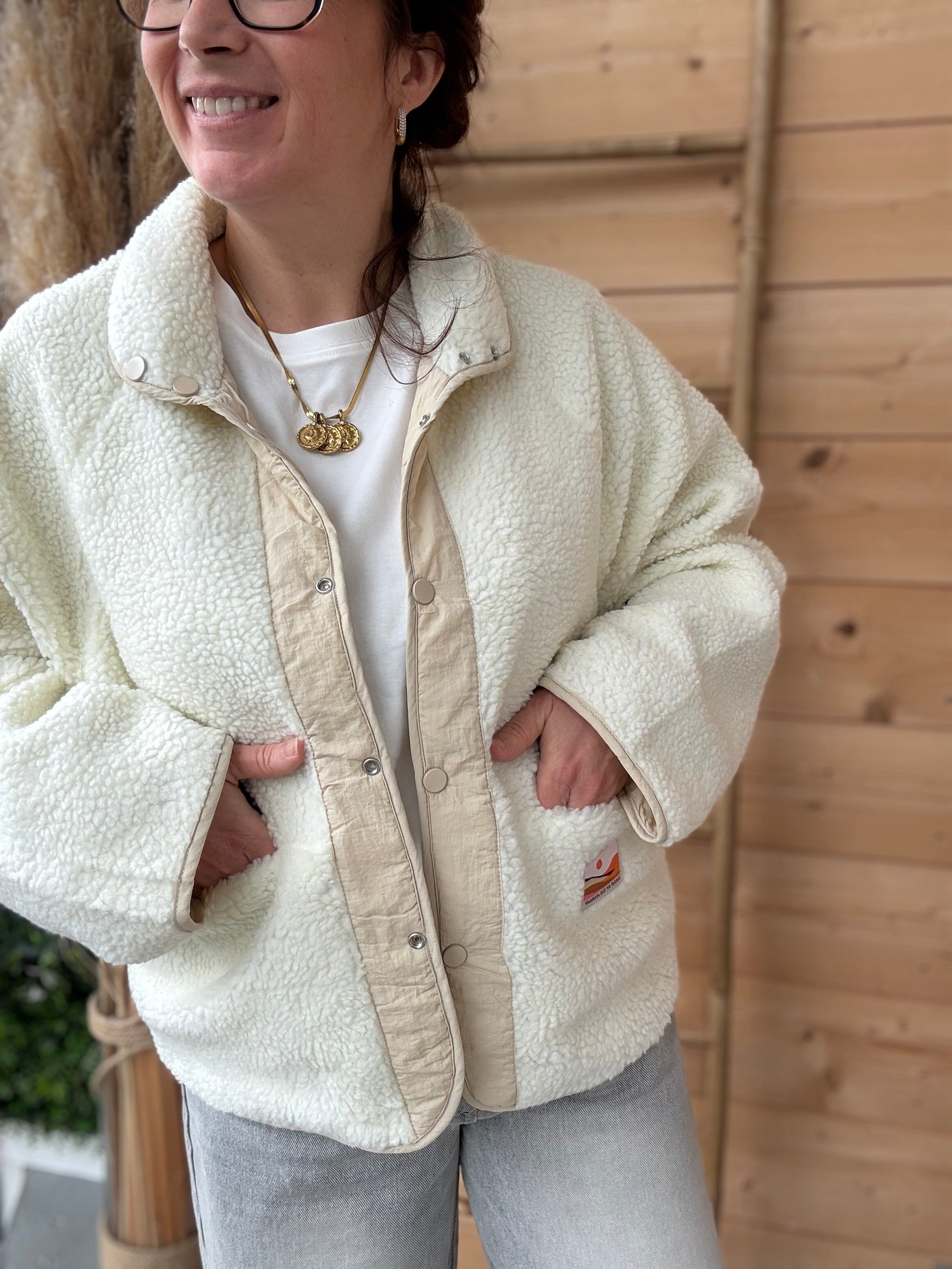 Mona revient dans un beige ultra facile à porter. Deux styles en une seule pièce : un côté moumoute tout doux et un côté lisse pour varier les ambiances. La veste parfaite pour mixer confort et style sans se poser de questions.